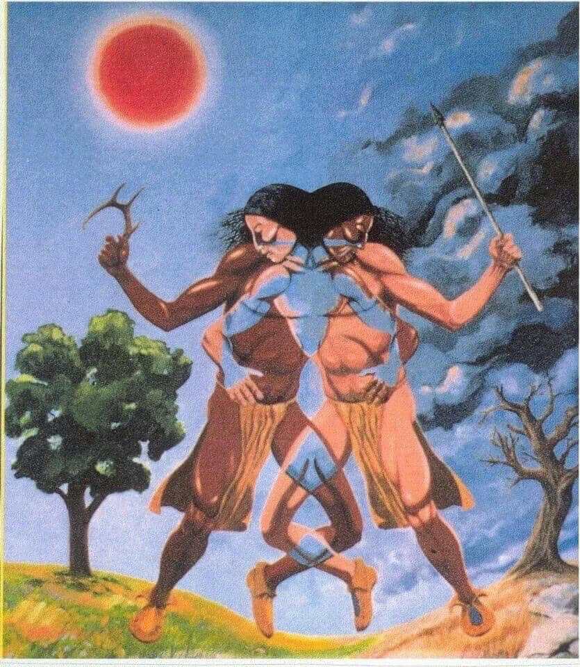 This legend was dictated by John Arthur Gibson, a former chief of the Seneca nation of the North American Iroquois confederation. McGilchrist describes it as "One of the most remarkable intuitions of the structure of mind and its influence on human destiny ever brought forth" and "A more vivid expression of an understanding of the world that also finds less vivid expression in the hemisphere hypothesis and in the efforts of various philosophers to put it in a more abstract form". While a young man, Gibson became the pupil of one of the oldest of the Onondaga, whose memory went back to the years before the dispersion of the Six Nations, in the aftermath of the American revolution. From him Gibson acquired the wide knowledge of the customs, traditions, and religion of his ancestors for which he became noted. He was never satisfied until he had "traced a custom or a belief back to its earliest remembered antecedents". In the Onondaga language, the name of one of the brothers is Tháęhya.wáʔgih (variously translated: "He Who Holds the Sky with Both Hands") and his twin is named Ohá.æʔ ("He Who is Flint"). The twins have many names, in many languages. For English and Japanese speakers, Taronhiawagon and Tawiscara (perhaps タロンヒアワゴン and タウィスカラ is how they would be written in katakana) may be among the easiest of these to say. Iain McGilchrist provides a very insightful description of these characters. "Tawiscara tends to do things that run counter to what is healthy, yet he actually cares in his own twisted way" is a consistent description. George Beaver (in the Brantford Expositor, 2 Mar 1994) wrote that Tawiscara's grandmother favored him despite his behavior, which is also an apt metaphor for how harmful perspectives can nonetheless be very attractive. Interestingly, he describes a contest between them that was only decided when Taronhiawagon outsmarted Tawiscara by playing to his sense of pride and vanity: he let him appear to win. That made him careless and allowed Taronhiawagon to overtake him. According to Gibson (and McGilchrist), Tawiscara is the more divisive of the two, and eventually the first brother comes to see that he will need to work with him closely to keep him from causing too much trouble. When the Brothers leave earth, the first warns that "there are two minds in human beings". The implication is clear. For creativity there must be complementarity, a degree of resistance within oneness. But we must learn the role appropriate to each of our minds, and establish the proper relationship between them. If not, he continued, "the things upon which you live will diminish so that finally nothing more will be able to grow".